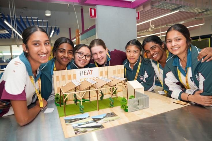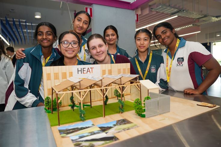 The Green Motion project from Catherine McAuley Westmead students Daphne, Ann, Isabel, Annie, Anushree, Sarah and Karen looks at heat stress in their school and the local Parramatta area. They devised a new shade structure that maximises light but reflects heat and includes a system for collecting water to feed low-maintenance plants that help make the space nice and comfortable. Their team won the award for Best Presentation (Secondary).